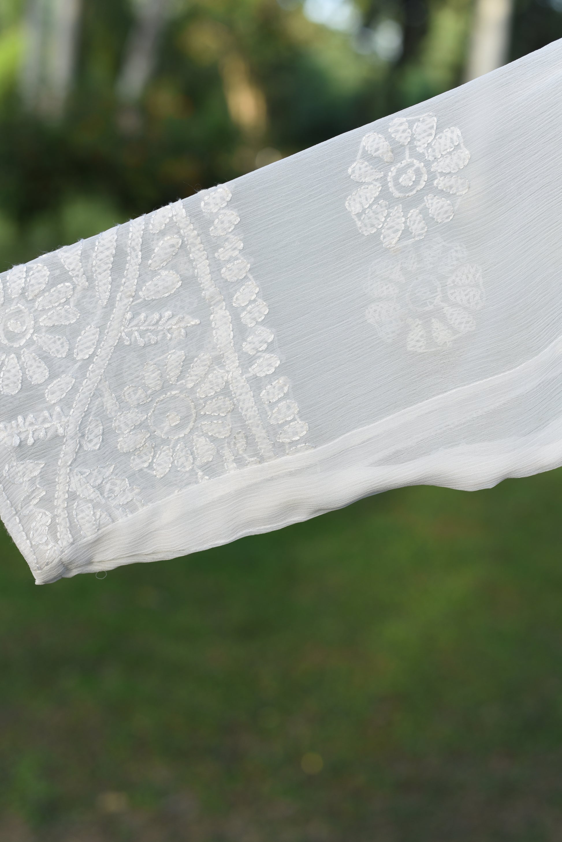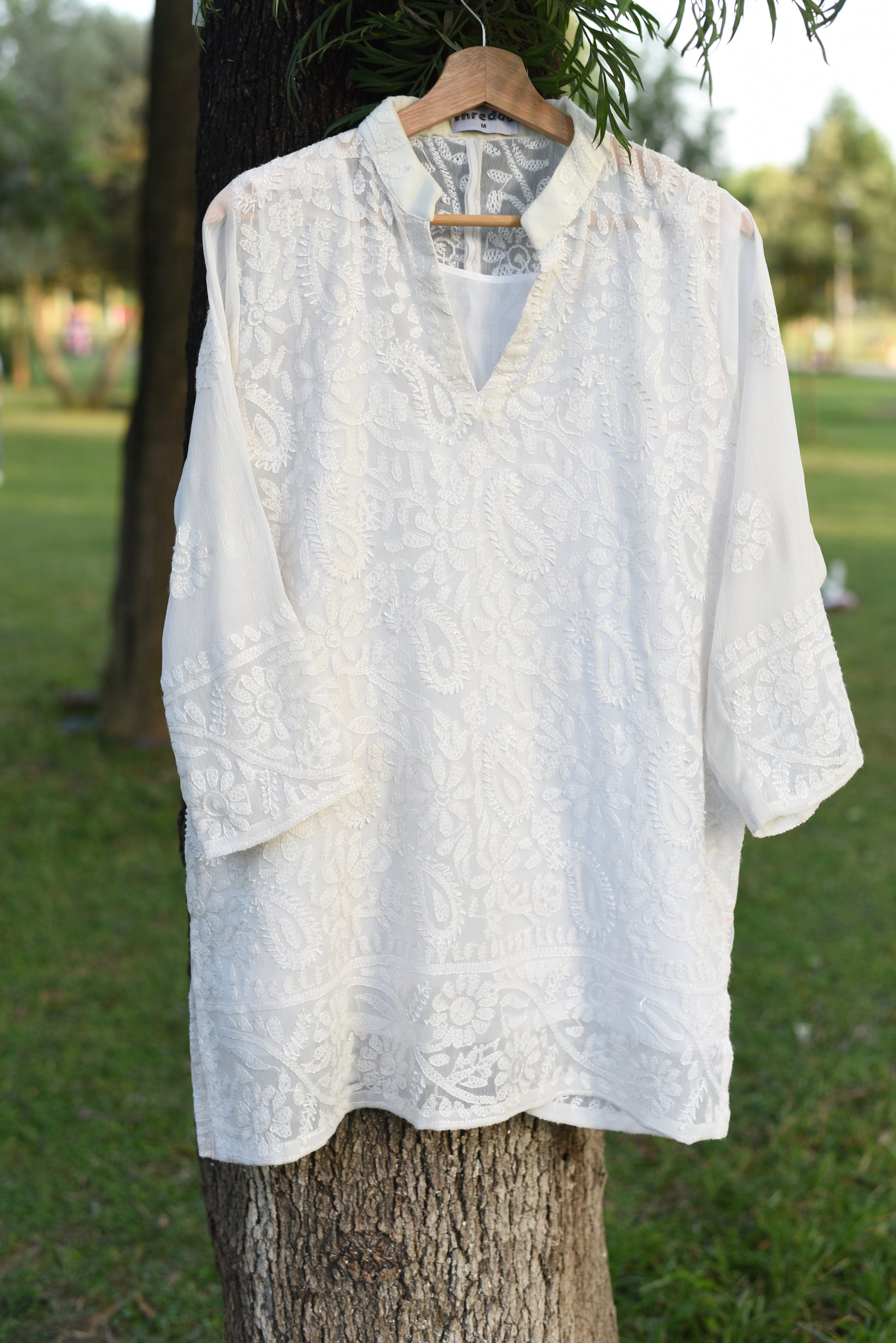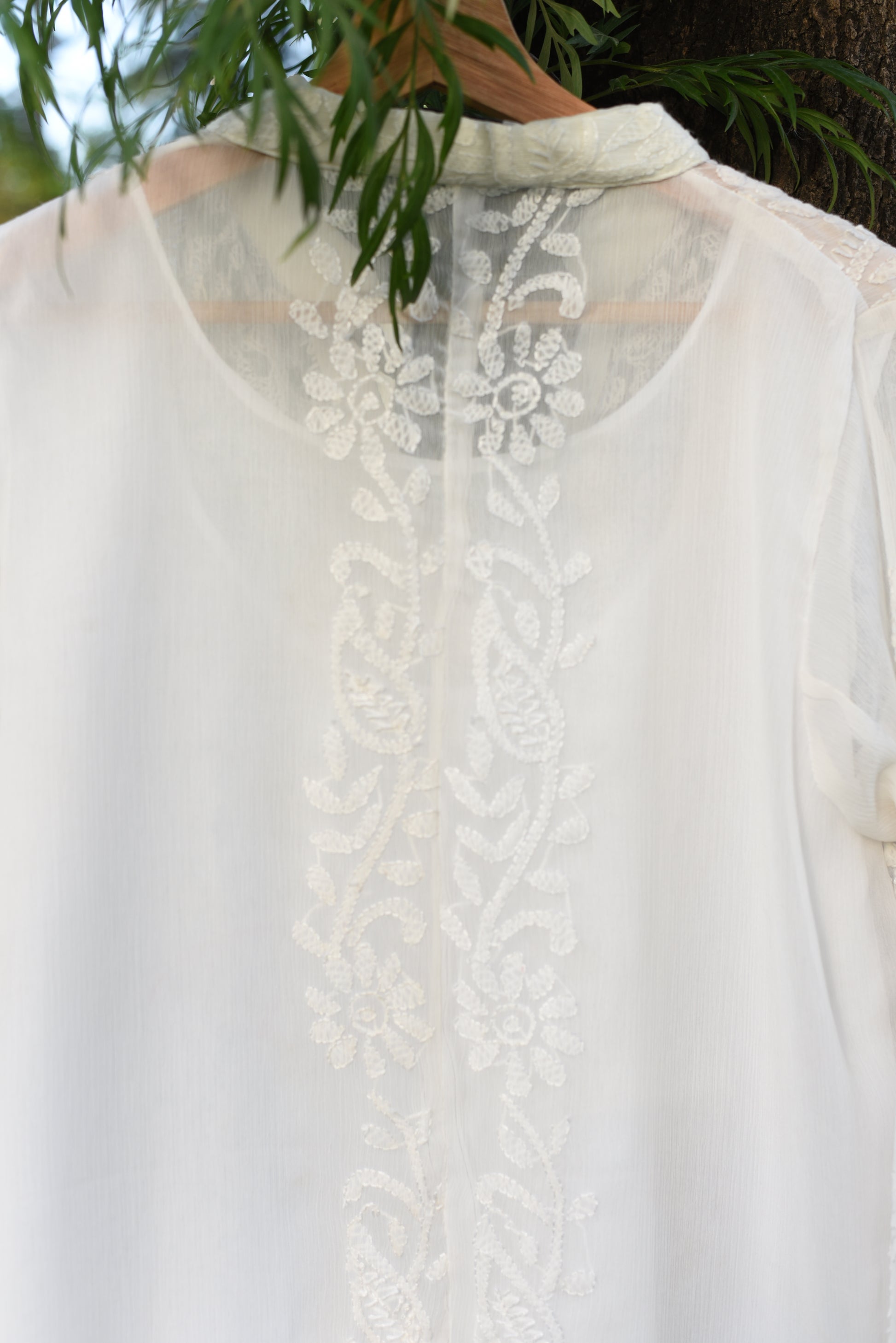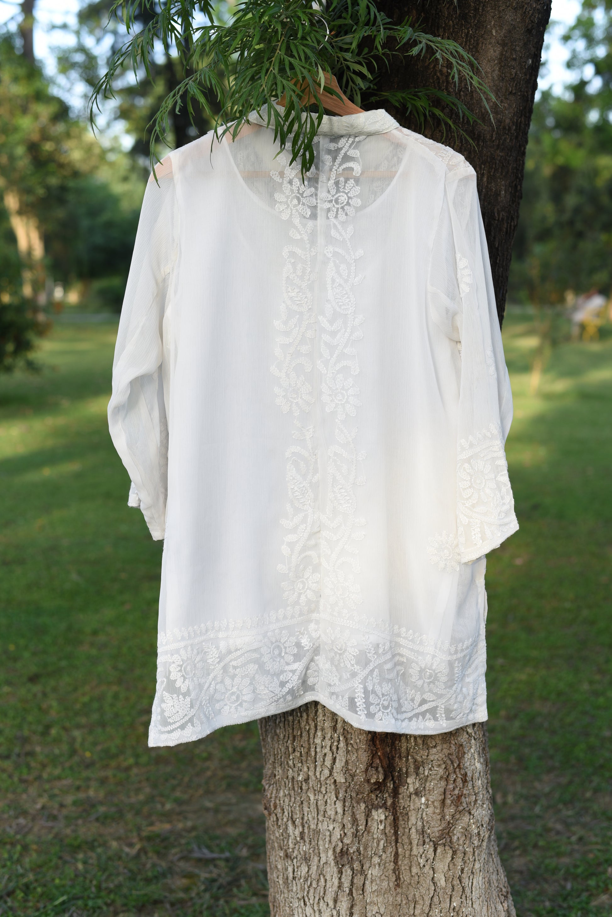 This elegant white chiffon shirt showcases exquisite hand embroidery, beautifully fusing traditional floral patterns with a modern, Western-inspired silhouette. Lightweight and effortlessly graceful, it features detailed embellishments on the neckline, sleeves, and hem—making it the perfect choice for women who value heritage craftsmanship with a contemporary twist.