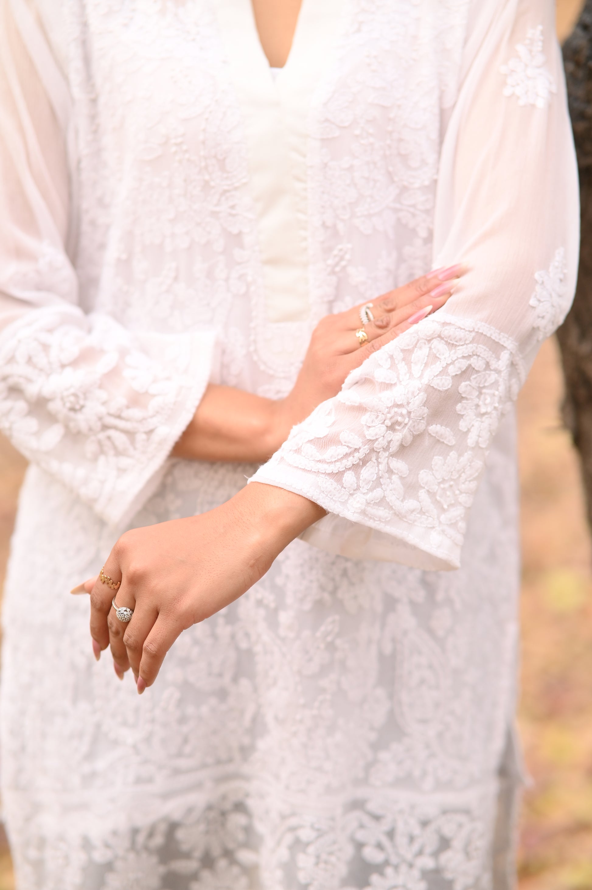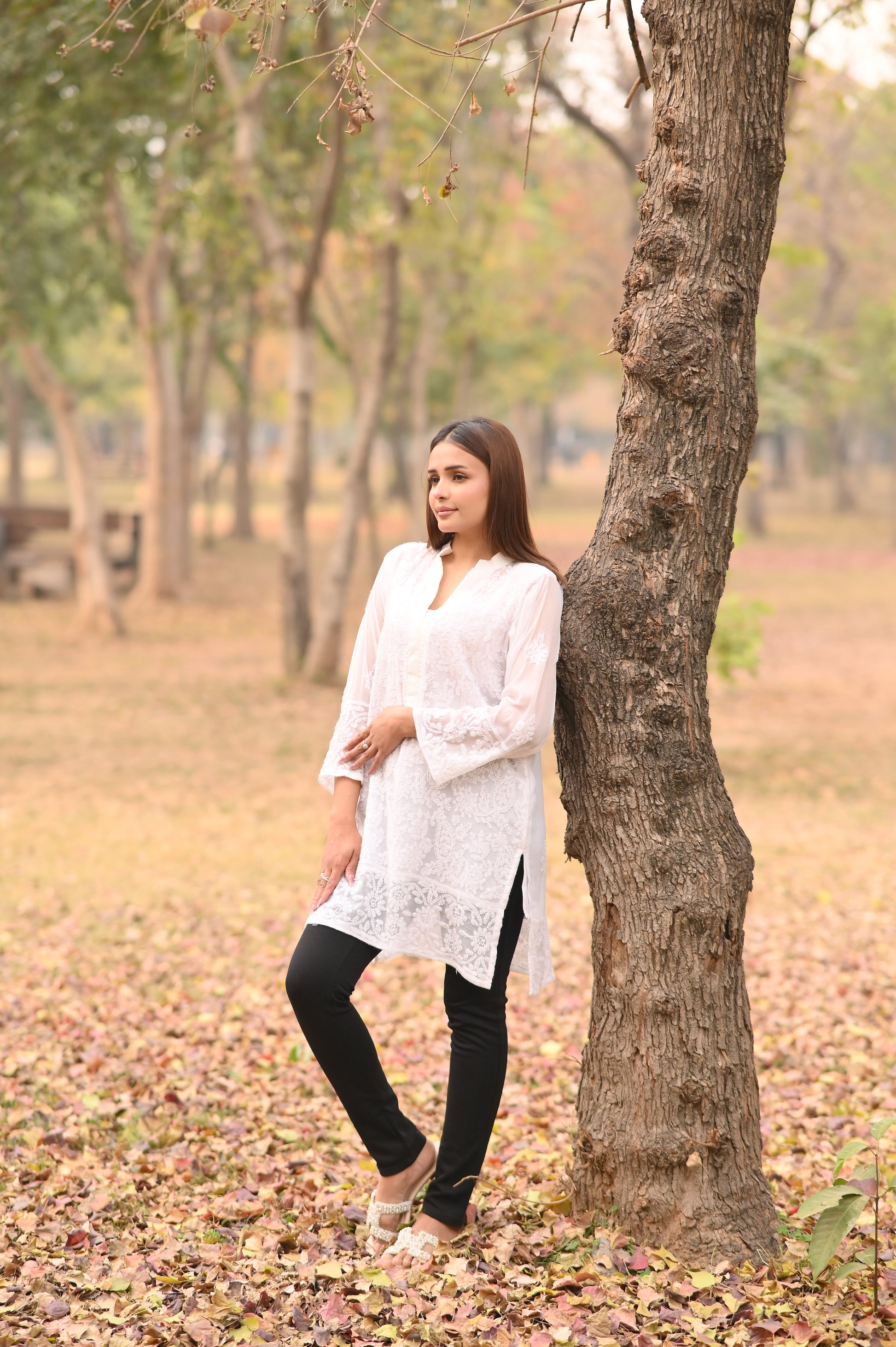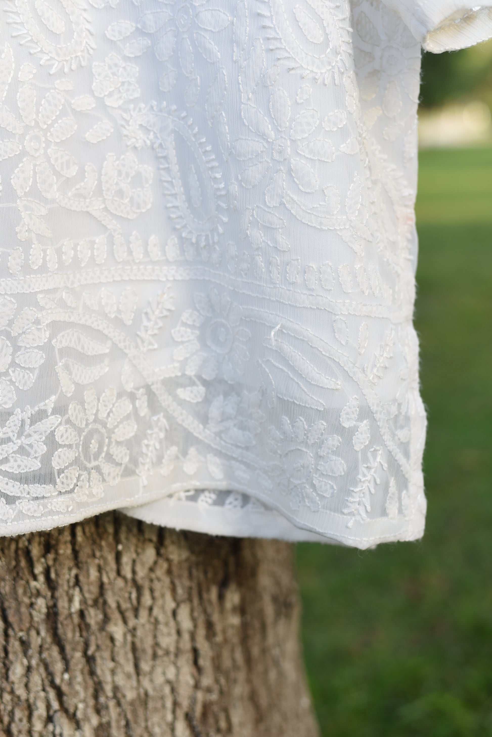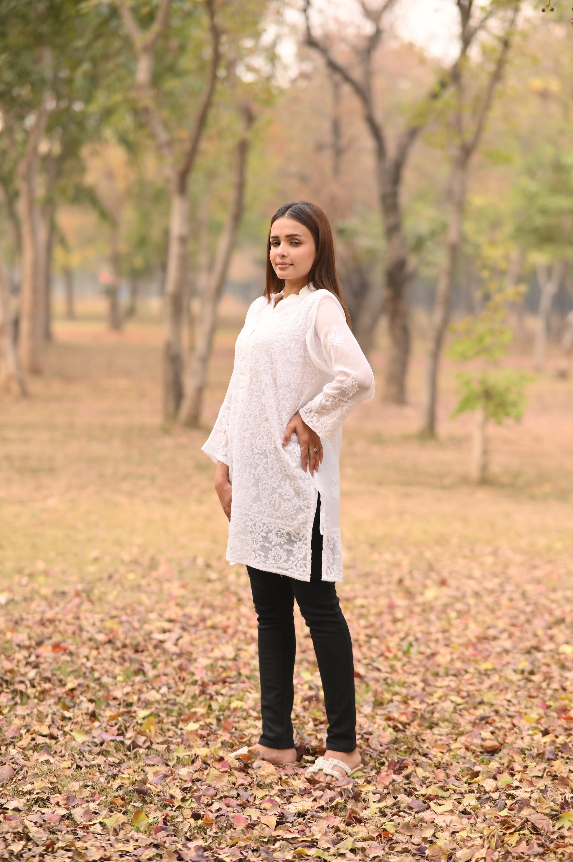 This elegant white chiffon shirt showcases exquisite hand embroidery, beautifully fusing traditional floral patterns with a modern, Western-inspired silhouette. Lightweight and effortlessly graceful, it features detailed embellishments on the neckline, sleeves, and hem—making it the perfect choice for women who value heritage craftsmanship with a contemporary twist.