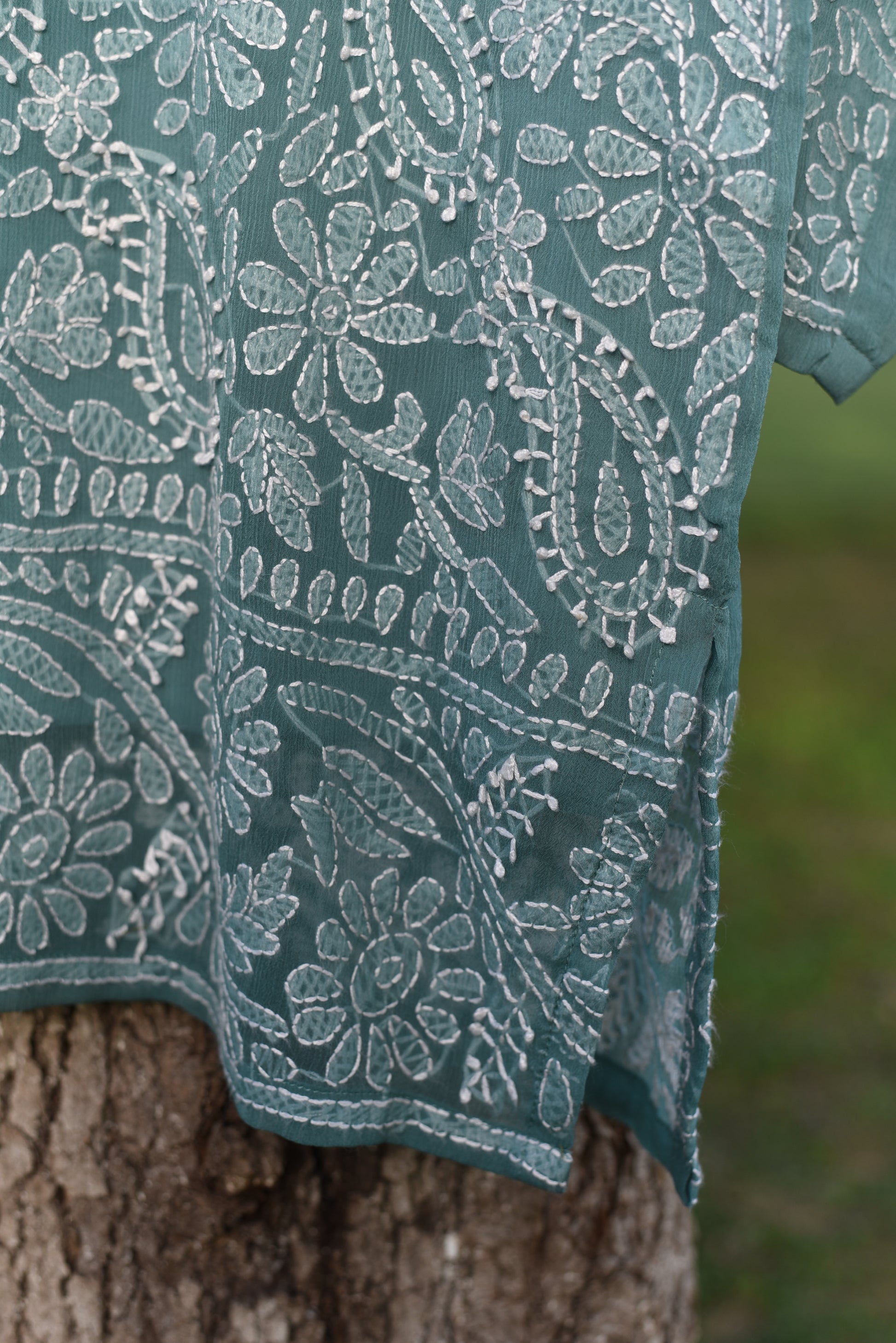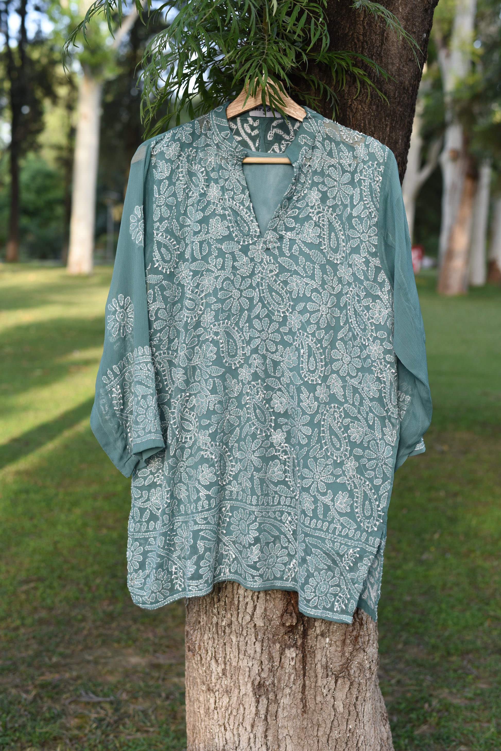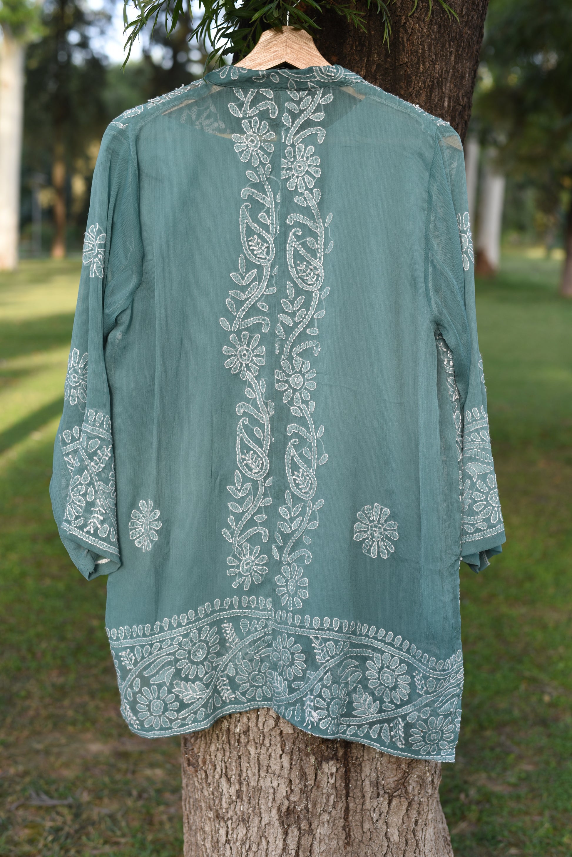 This elegant Turqoise chiffon shirt showcases exquisite hand embroidery, beautifully fusing traditional floral patterns with a modern, Western-inspired silhouette. Lightweight and effortlessly graceful, it features detailed embellishments on the neckline, sleeves, and hem—making it the perfect choice for women who value heritage craftsmanship with a contemporary twist.
