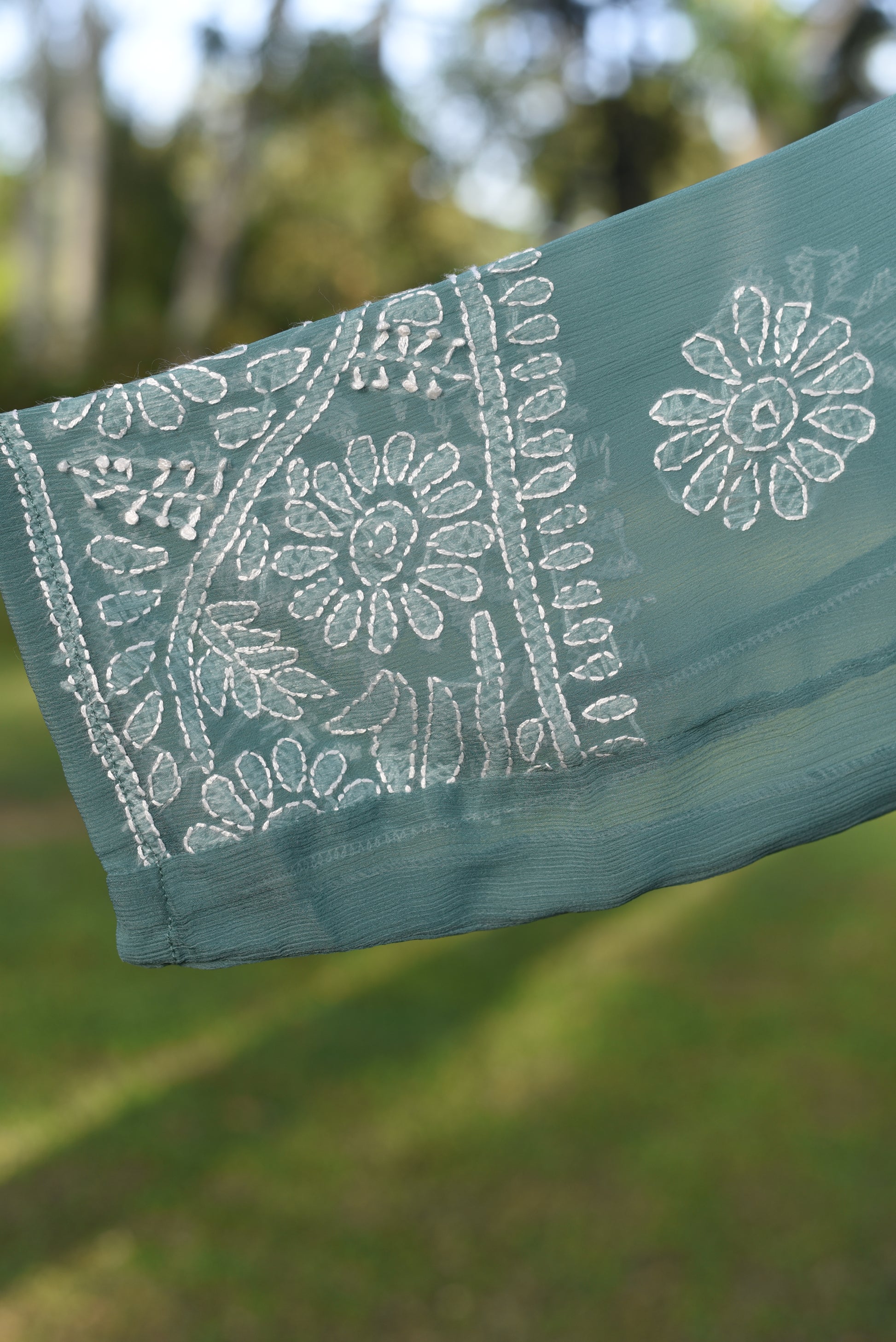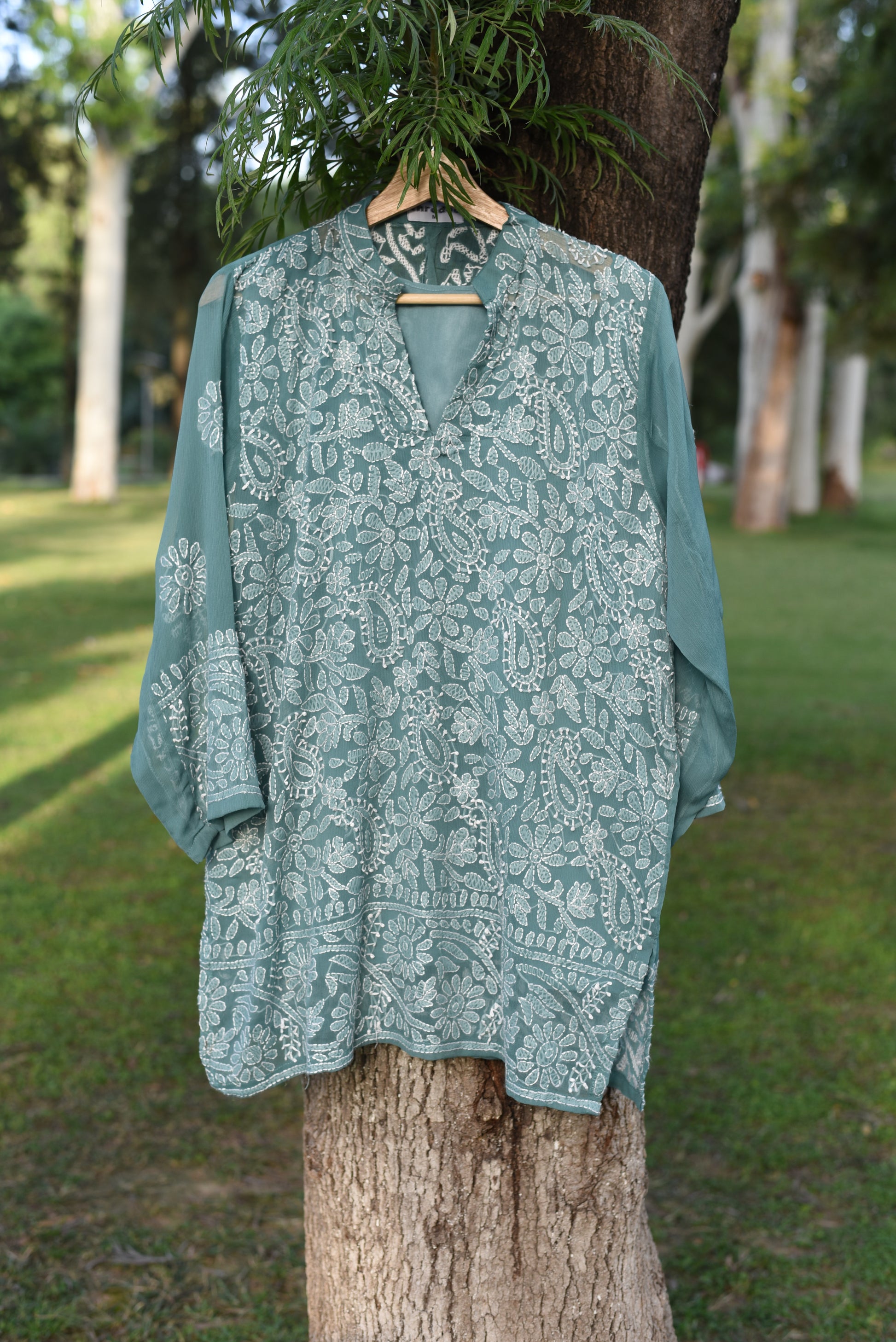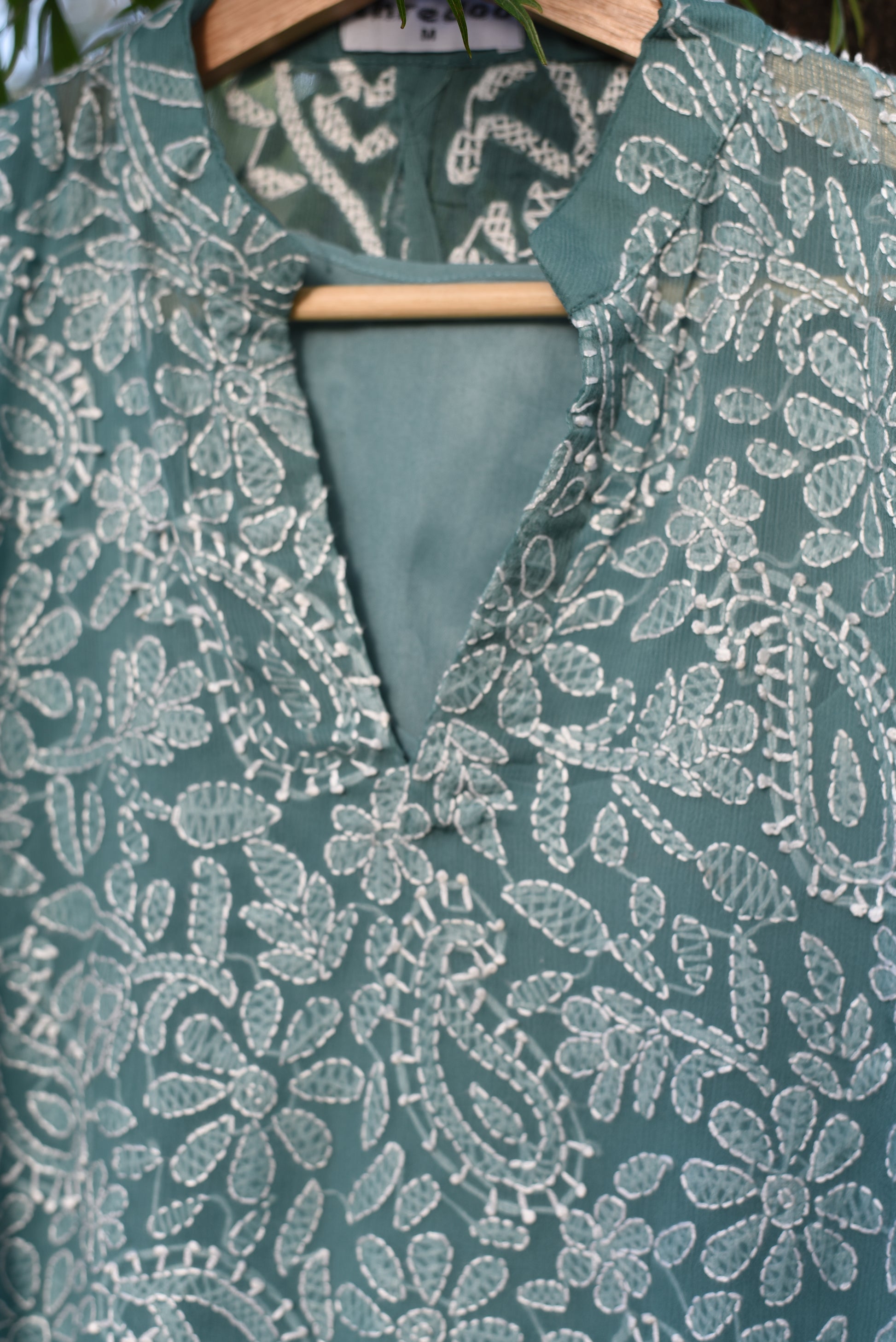 This elegant Turqoise chiffon shirt showcases exquisite hand embroidery, beautifully fusing traditional floral patterns with a modern, Western-inspired silhouette. Lightweight and effortlessly graceful, it features detailed embellishments on the neckline, sleeves, and hem—making it the perfect choice for women who value heritage craftsmanship with a contemporary twist.
