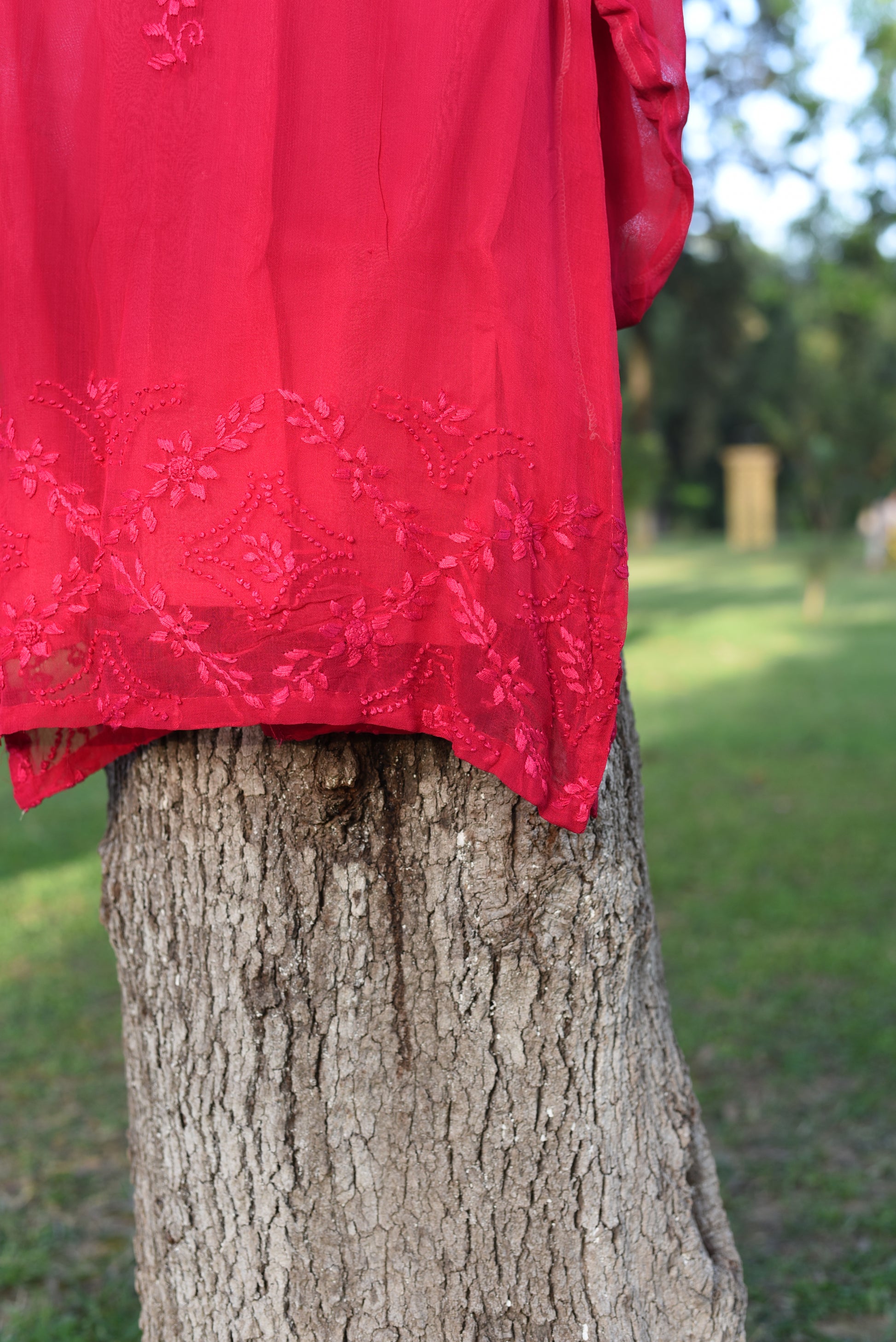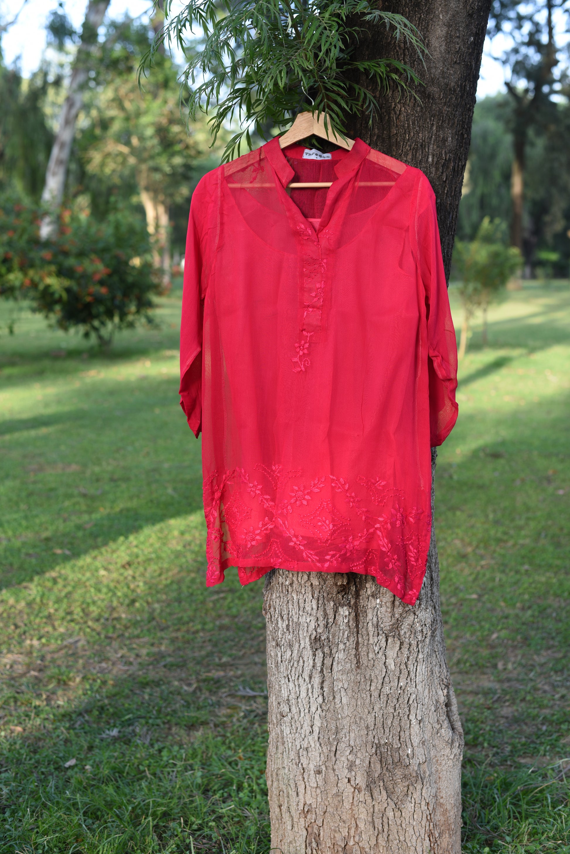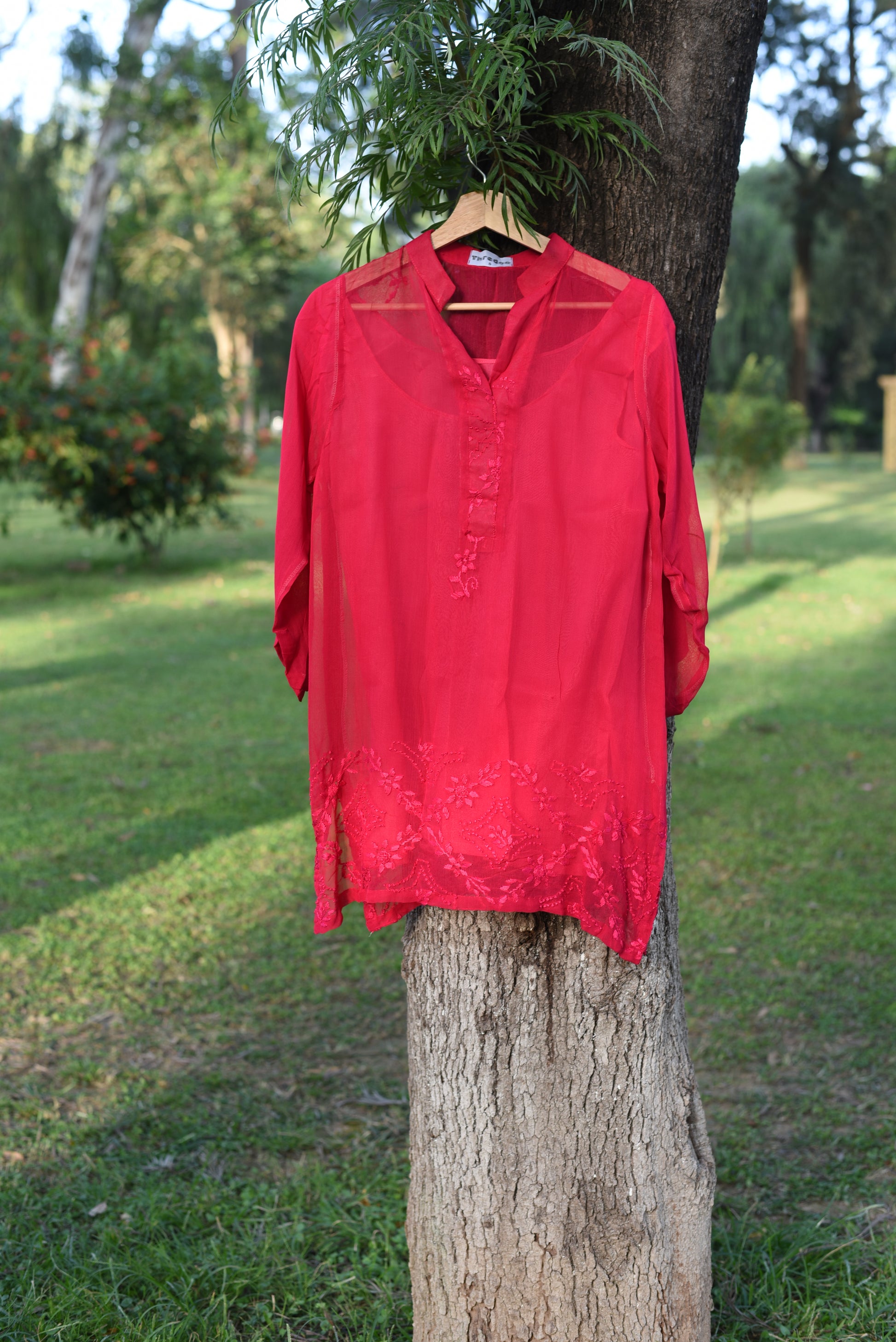 This elegant Pink chiffon shirt showcases exquisite hand embroidery, beautifully fusing traditional floral patterns with a modern, Western-inspired silhouette. Lightweight and effortlessly graceful, it features detailed embellishments on the neckline, sleeves, and hem—making it the perfect choice for women who value heritage craftsmanship with a contemporary twist.