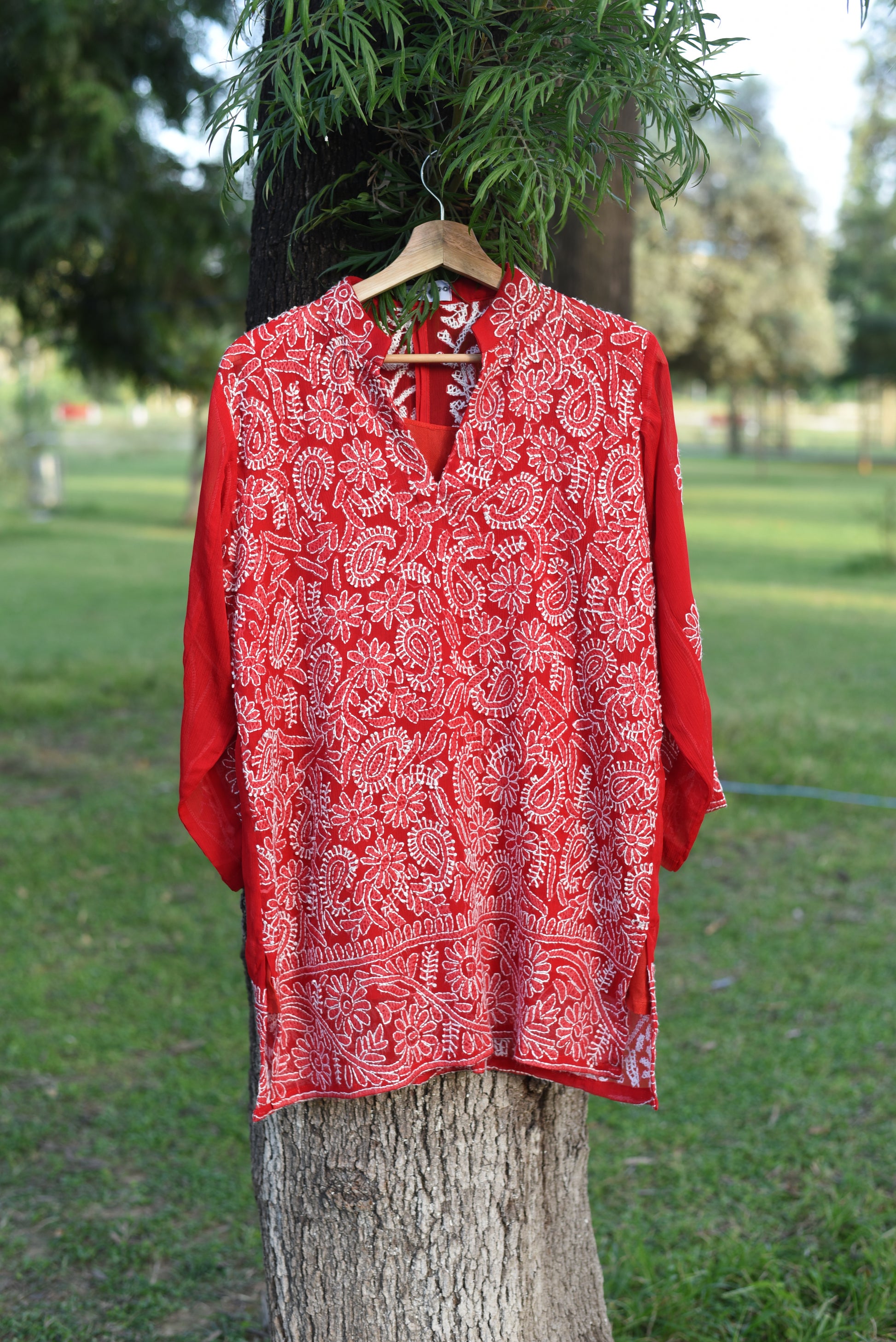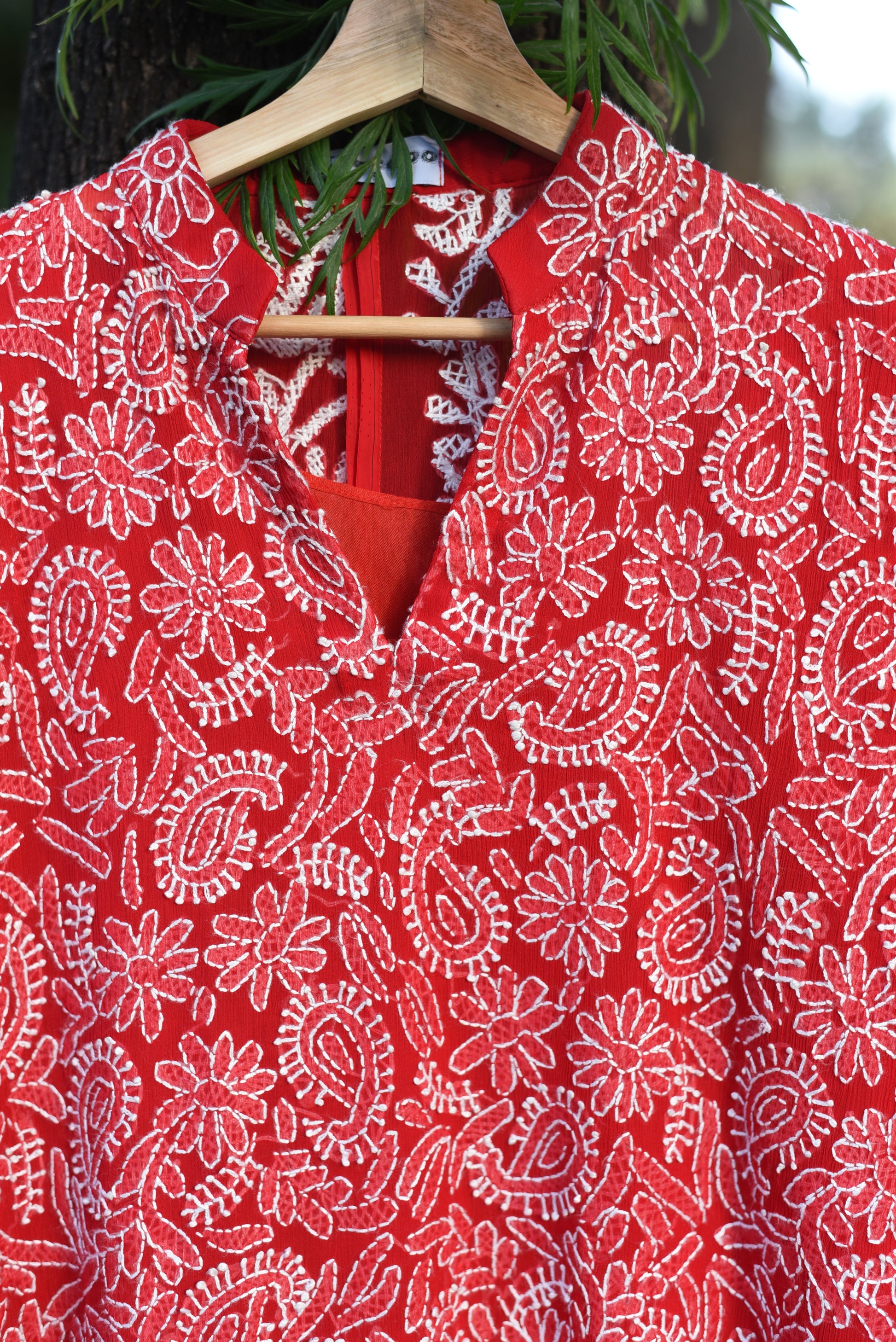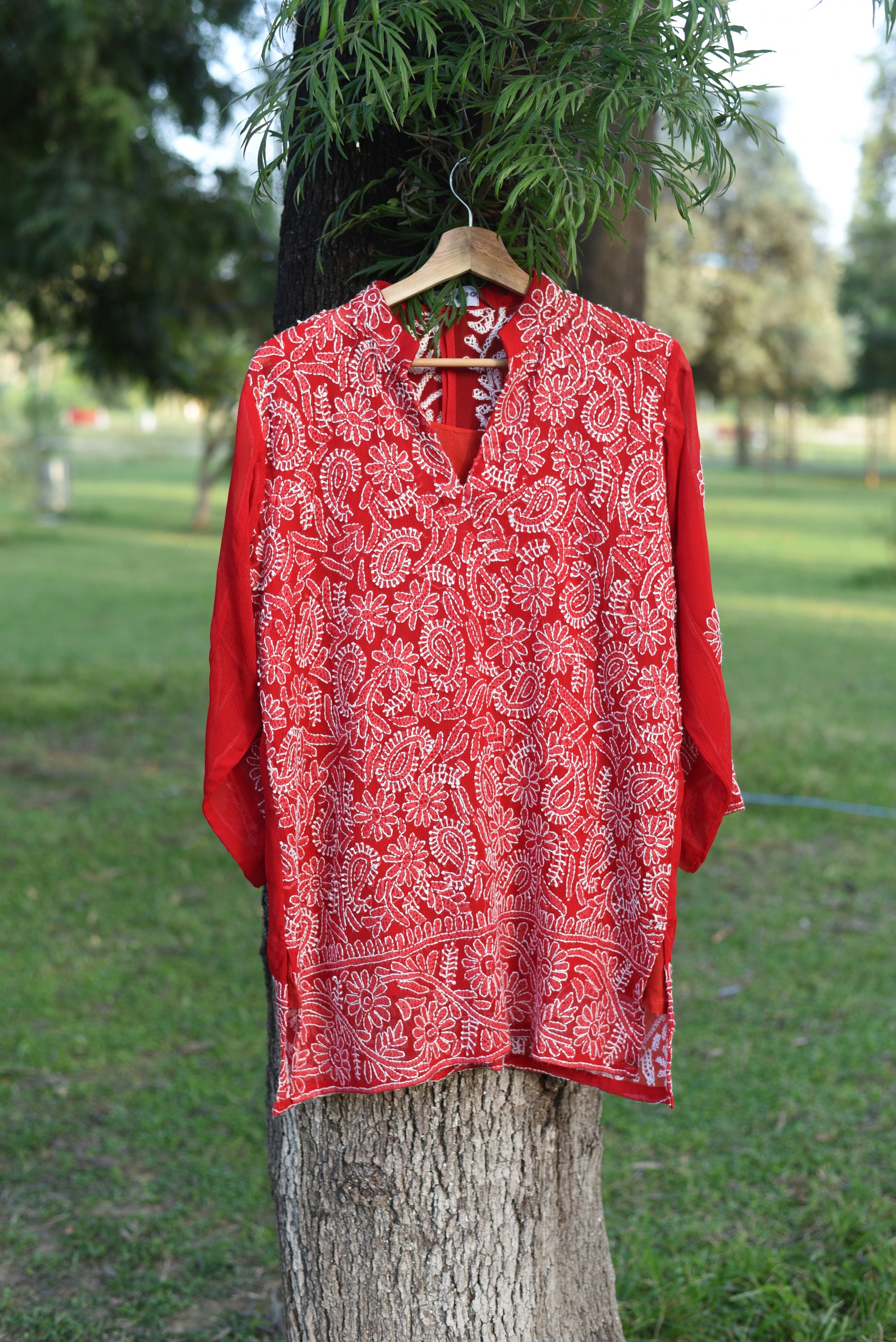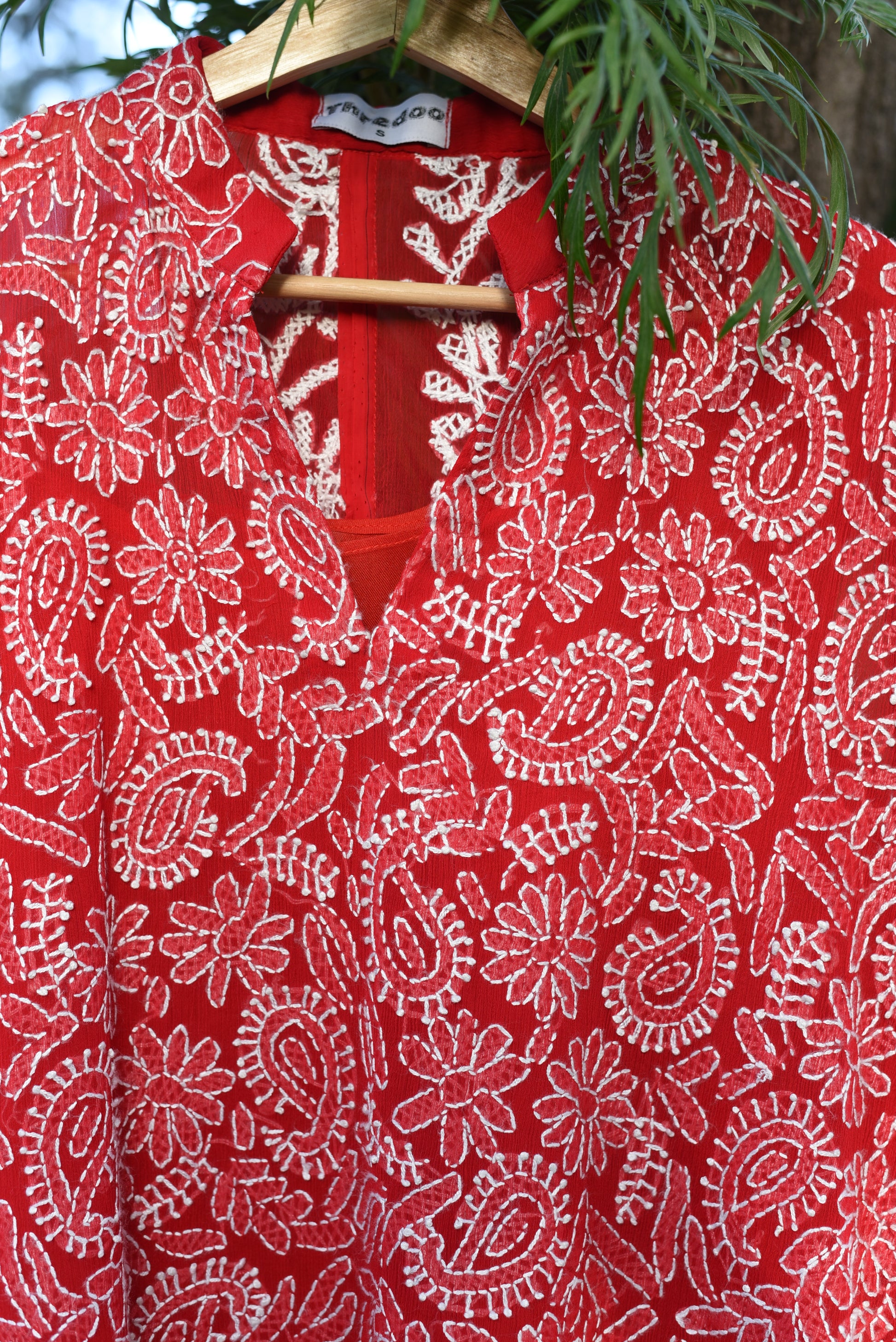 This elegant red chiffon shirt showcases exquisite hand embroidery, beautifully fusing traditional floral patterns with a modern, Western-inspired silhouette. Lightweight and effortlessly graceful, it features detailed embellishments on the neckline, sleeves, and hem—making it the perfect choice for women who value heritage craftsmanship with a contemporary twist.