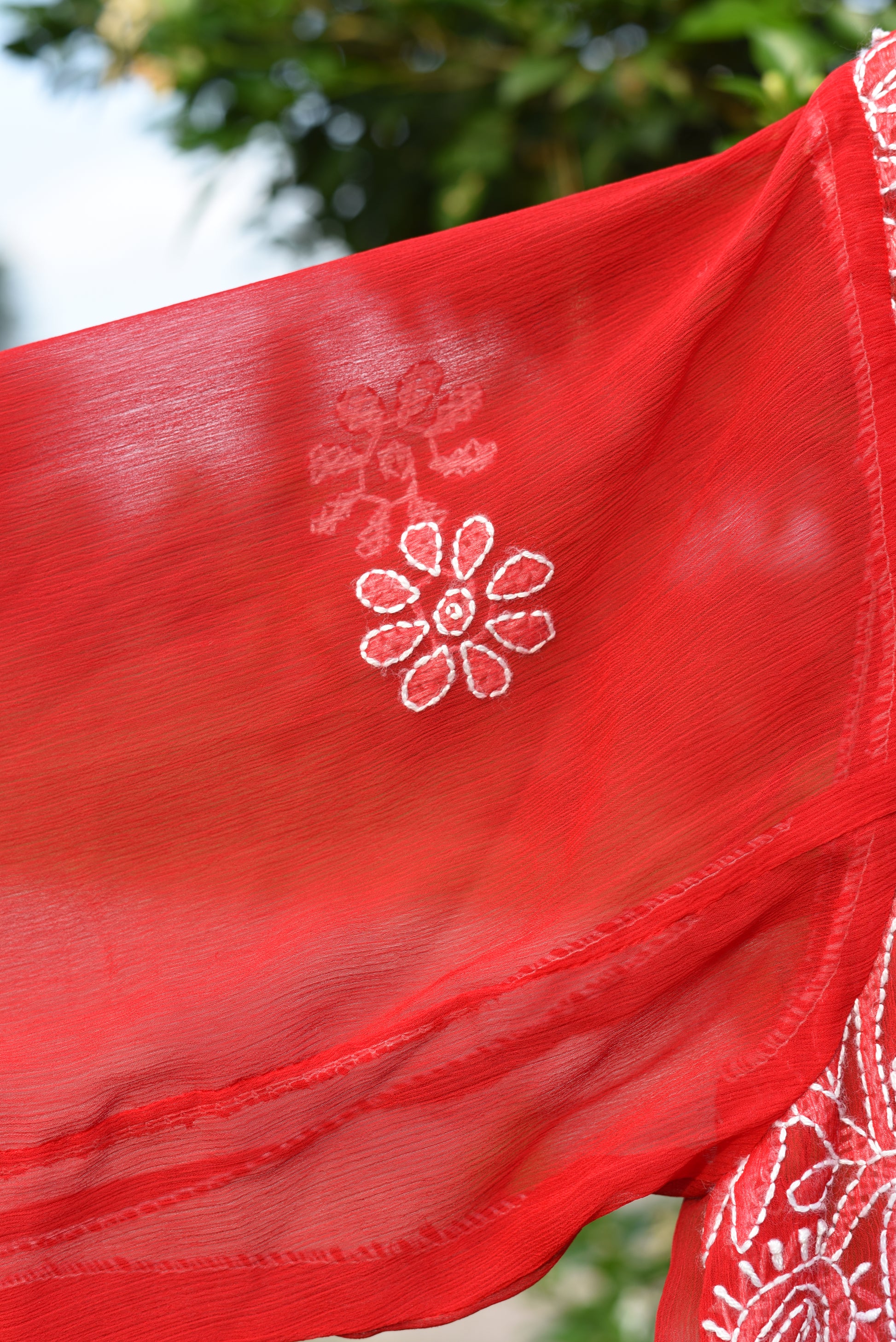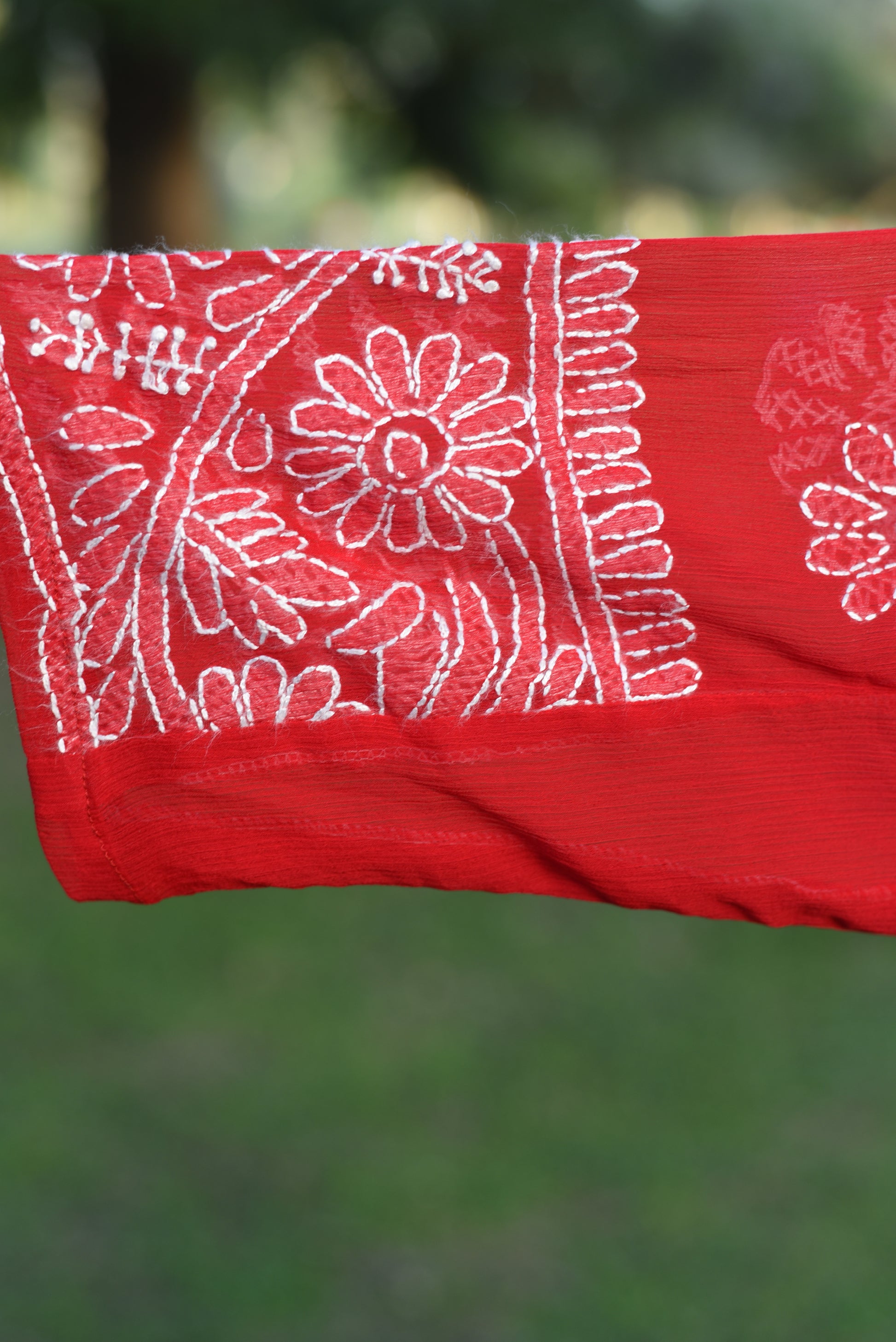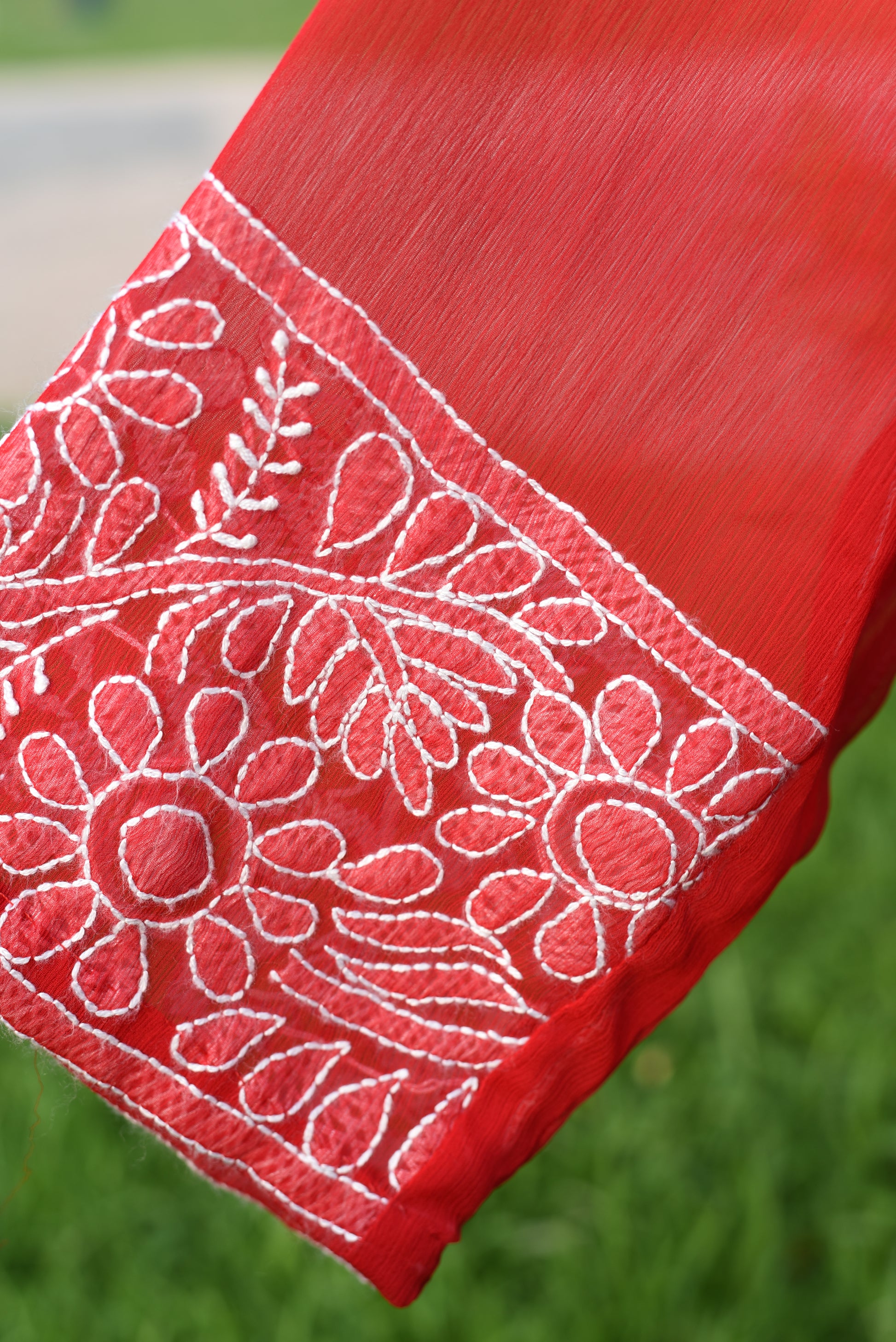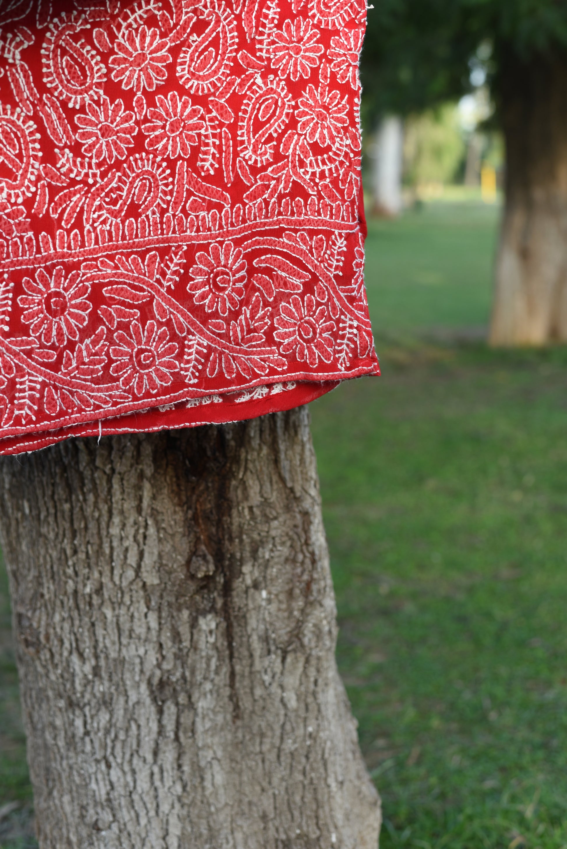 This elegant red chiffon shirt showcases exquisite hand embroidery, beautifully fusing traditional floral patterns with a modern, Western-inspired silhouette. Lightweight and effortlessly graceful, it features detailed embellishments on the neckline, sleeves, and hem—making it the perfect choice for women who value heritage craftsmanship with a contemporary twist.