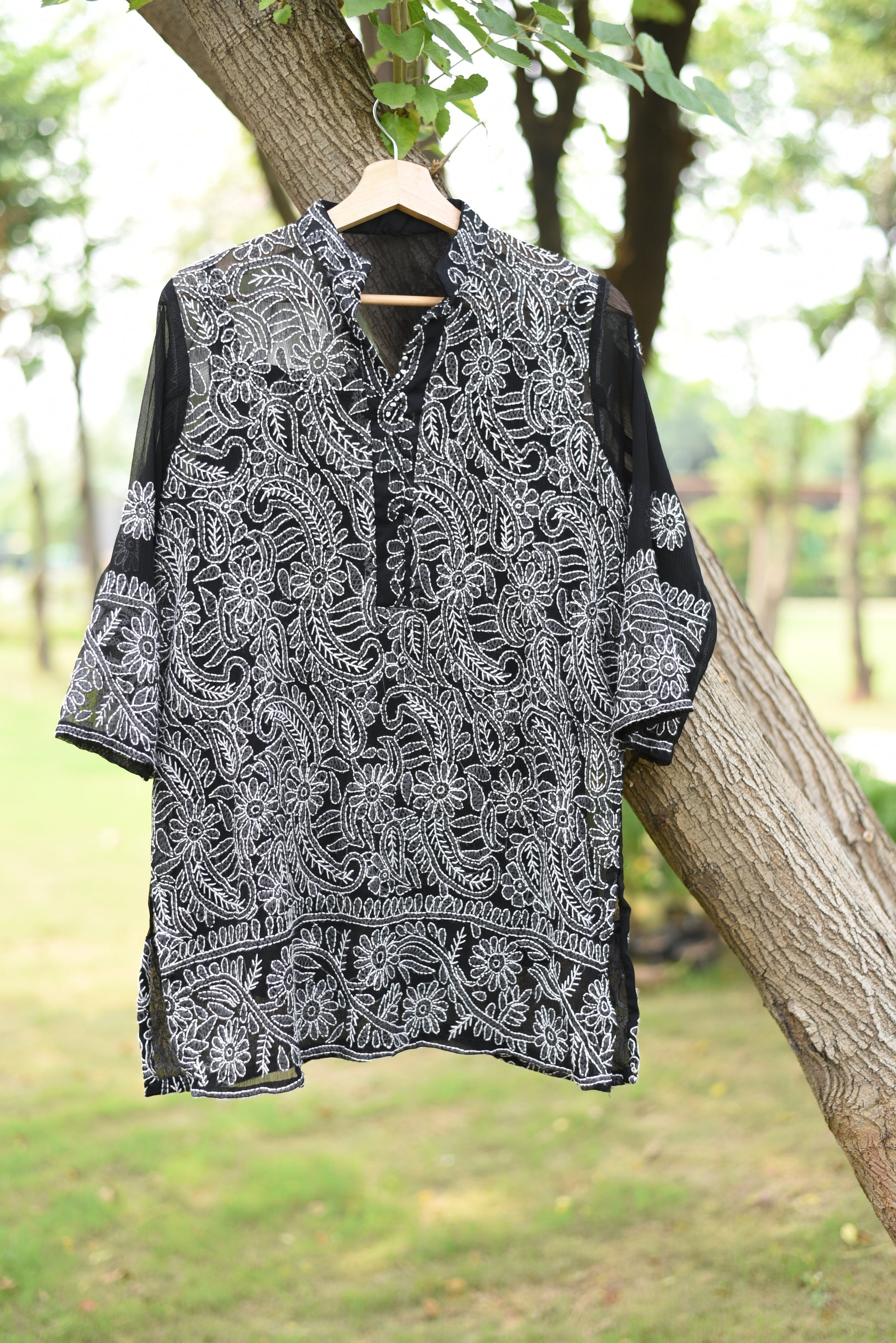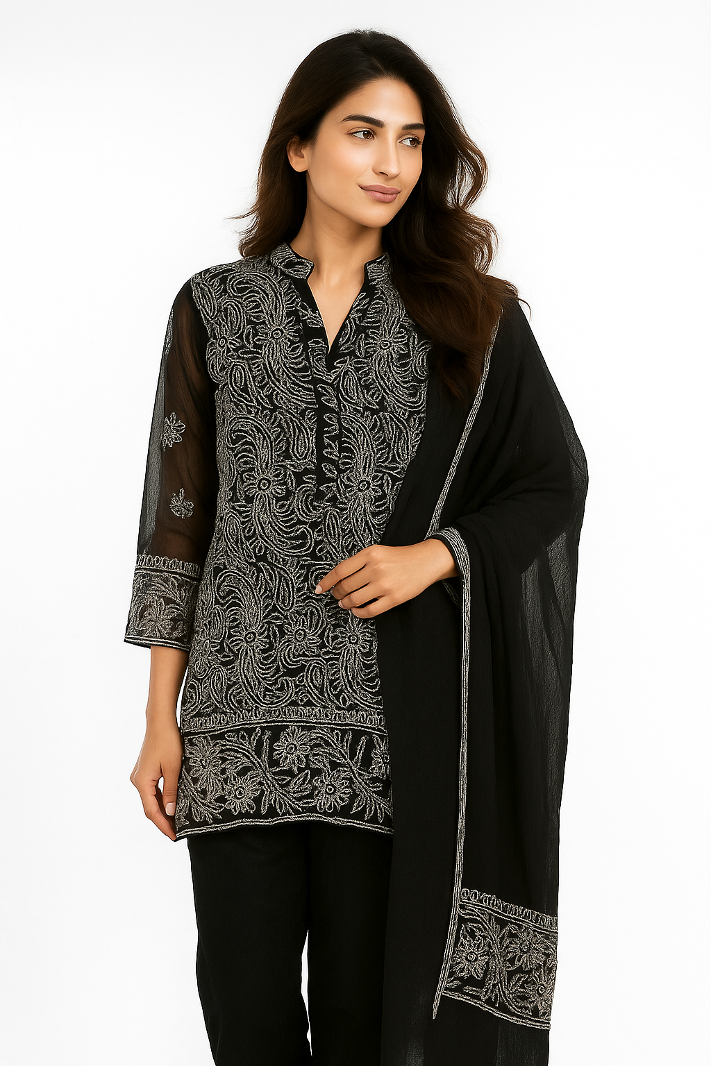 This elegant black chiffon shirt showcases exquisite hand embroidery, beautifully fusing traditional floral patterns with a modern, Western-inspired silhouette. Lightweight and effortlessly graceful, it features detailed embellishments on the neckline, sleeves, and hem—making it the perfect choice for women who value heritage craftsmanship with a contemporary twist.